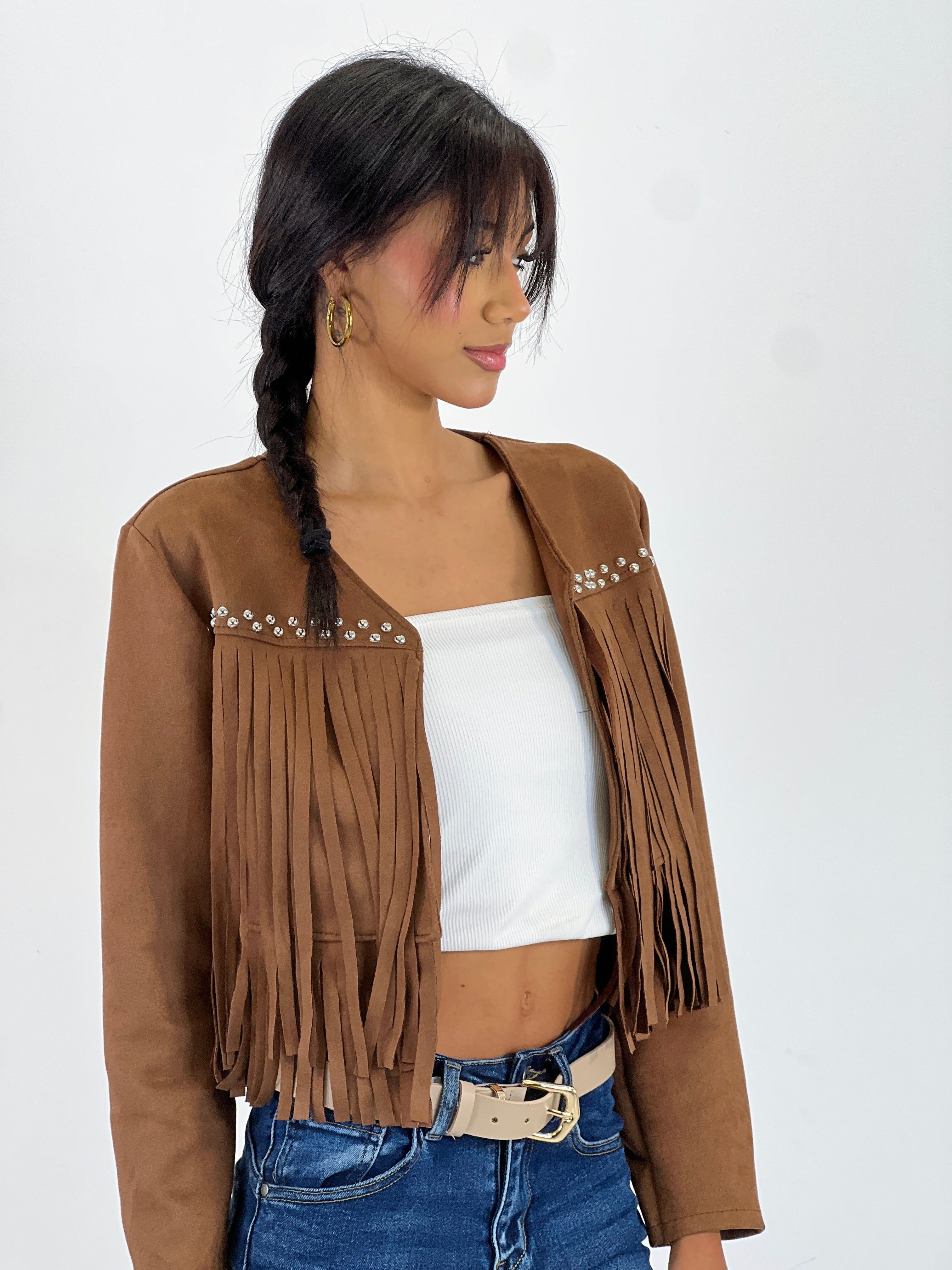 Aquesta jaqueta de pell de serra combina serrells detallats amb tacs metàl·lics que aporten un aire contemporani i atrevit. La seva confecció en suau pell de serra ofereix comoditat i durabilitat, mentre que els elements decoratius li confereixen un estil distintiu i elegant. Ideal per a qui desitgi destacar amb una peça que fusiona tradició i modernitat en un disseny versàtil per a múltiples ocasions.