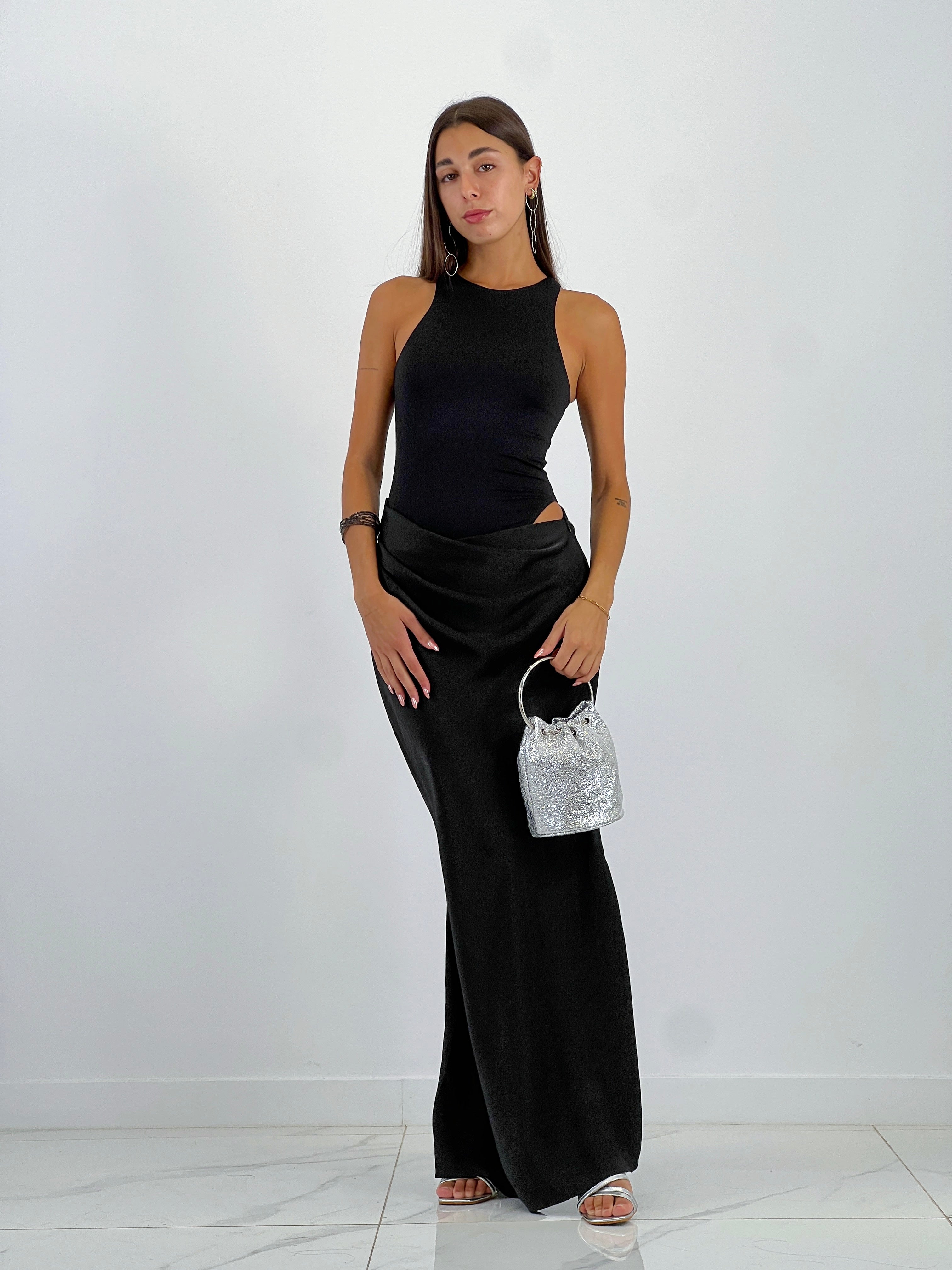 Este vestido sin mangas combina elegantemente raso y tactel, ofreciendo un diseño cut out que aporta un toque moderno y original. Su confección en materiales de alta calidad garantiza comodidad y un acabado impecable, ideal para ocasiones especiales donde se busca un estilo distinguido y actual.