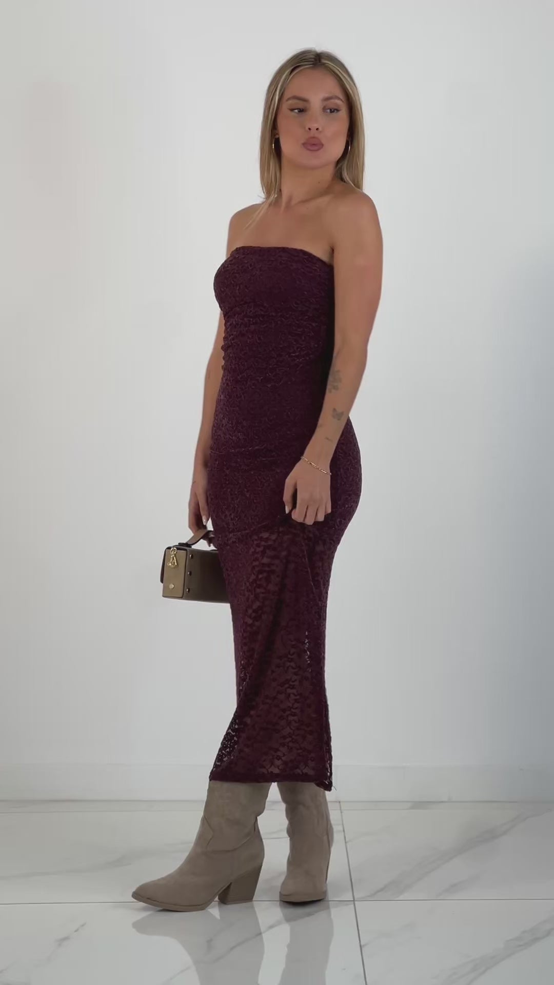 This dress combines the elegance of lace with the softness of velvet in a strapless design that highlights the neckline with sophistication. Its side ruching provides a flattering fit to the body, subtly and refinedly enhancing the silhouette, ideal for special occasions where a touch of distinction and delicacy is sought.
